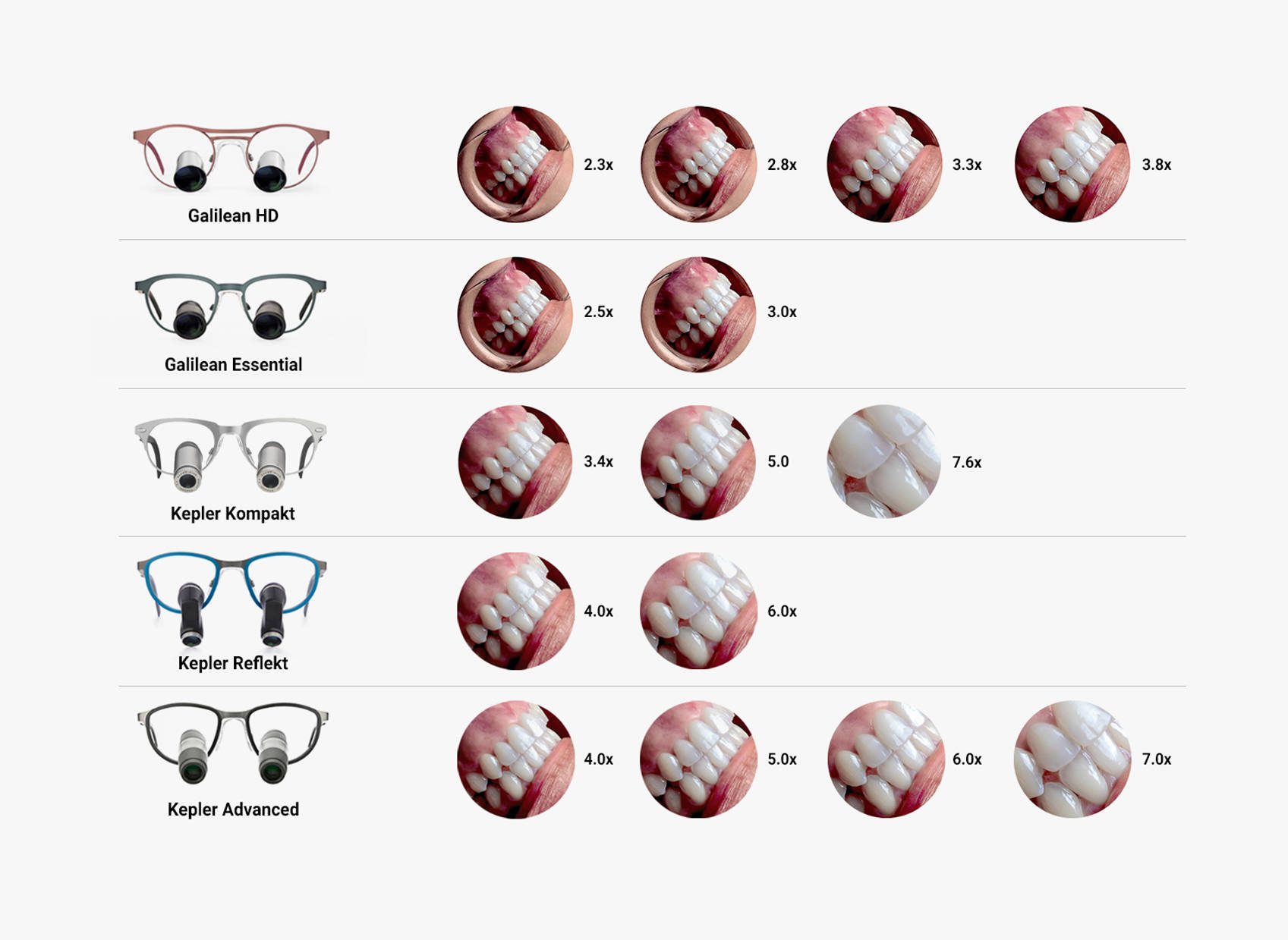 The magnifications in our Galilean range provide the user with a larger range of movement and depth of field than the higher magnifications of the Kepler system.
