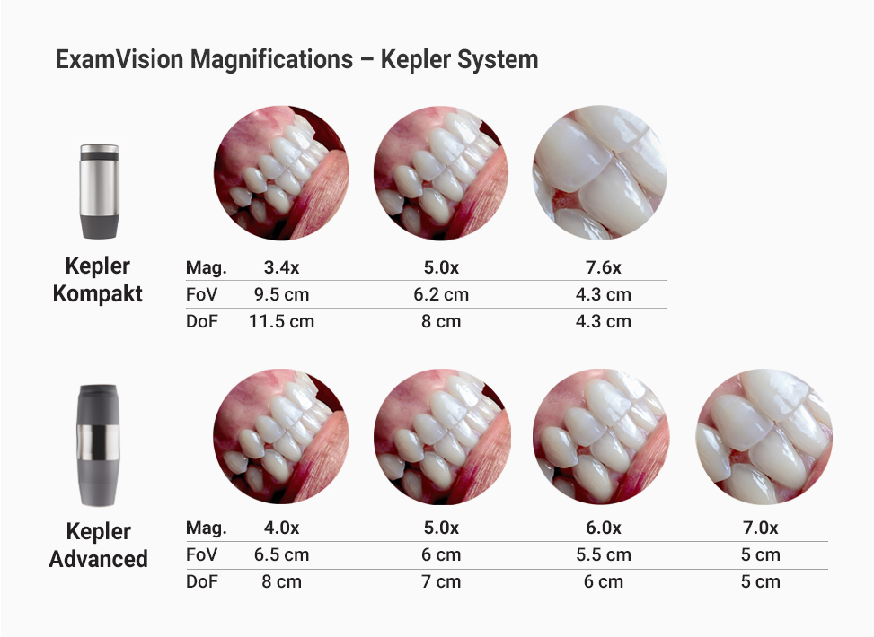 Kepler lenses allow for stronger magnification and an edge-to-edge sharp image thanks to the use of our lightweight prisms. ExamVision uses the best ultra-lightweight materials in our Kepler systems to make them some of the shortest and lightest Kepler loupes on the market. And the Fine-Focus feature on each ocular allows you to achieve the clearest and best binocular magnification with an optimal depth of field.